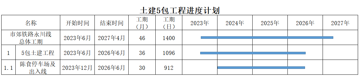 市郊鐵路重慶中心城區(qū)至永川線工程計劃施工總工期60個月。本招標(biāo)項目計劃于2023年6月30日開工,計劃1096日歷天按合同約定實施和完成本承包工程。