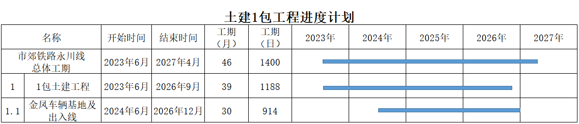 市郊鐵路重慶中心城區(qū)至永川線工程計(jì)劃施工總工期60個(gè)月。本招標(biāo)項(xiàng)目計(jì)劃于2023年6月30日開工,計(jì)劃1188日歷天按合同約定實(shí)施和完成本承包工程。