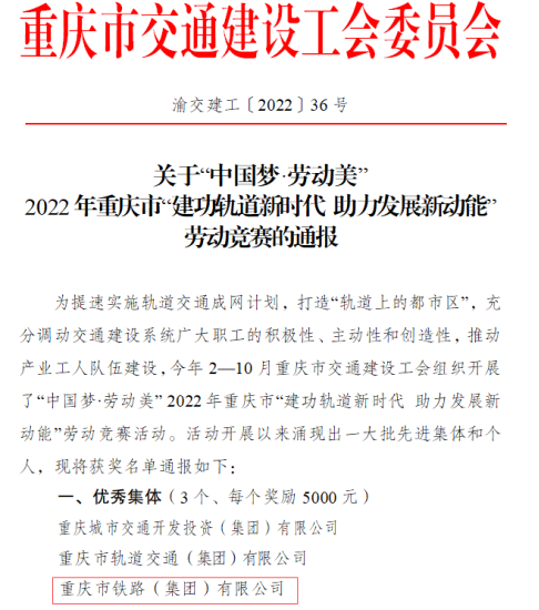 近日,重慶市交通建設(shè)工會(huì)對(duì)“建功軌道新時(shí)代 助力發(fā)展新動(dòng)能”勞動(dòng)競(jìng)賽的優(yōu)秀集體、班組和個(gè)人進(jìn)行了表彰,市鐵路集團(tuán)榮獲“優(yōu)秀集體”,城軌快線15號(hào)線項(xiàng)目部、27號(hào)線項(xiàng)目部獲“優(yōu)秀班組”,6人分別獲得“優(yōu)秀個(gè)人”“優(yōu)秀組織獎(jiǎng)(個(gè)人)”。