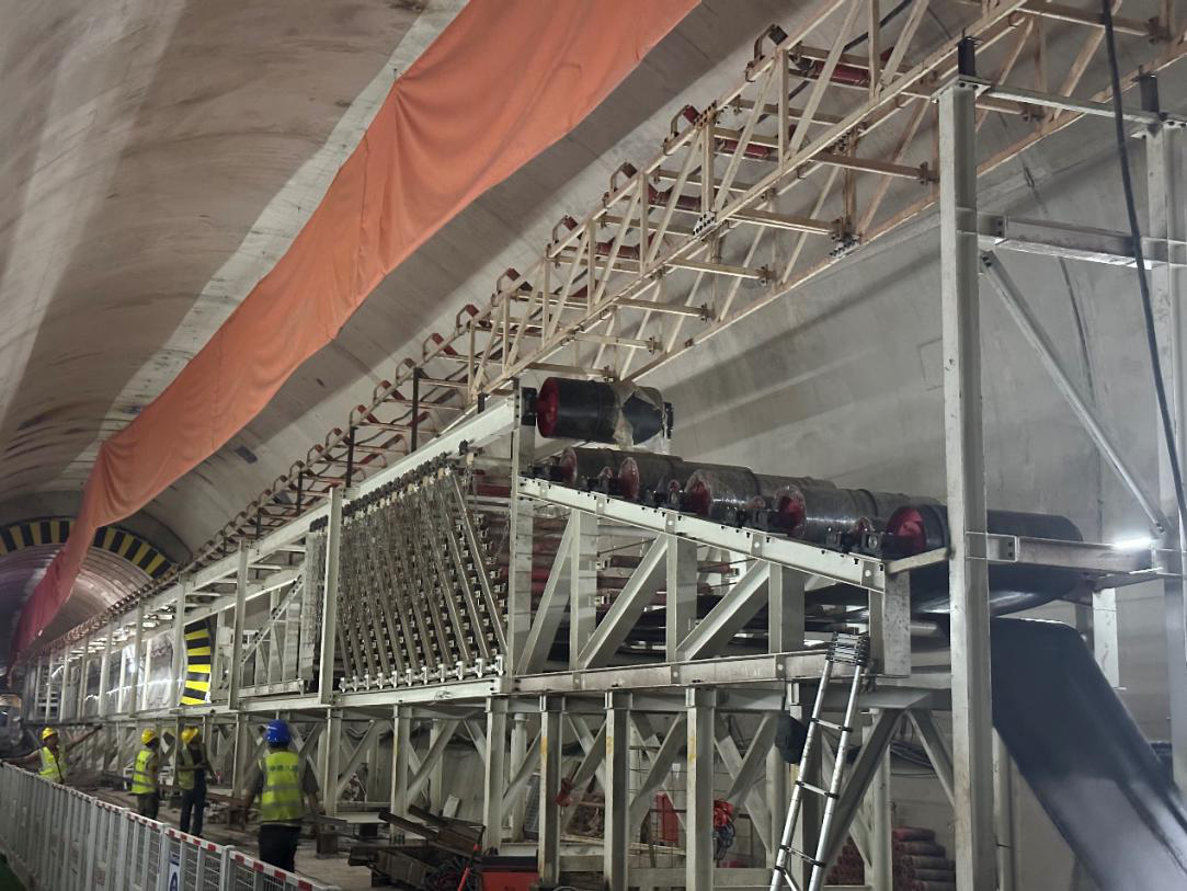 沙石區(qū)間右線渣土運(yùn)輸皮帶輸送機(jī)安裝施工過(guò)程影像
