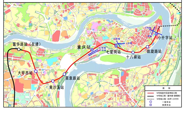 18號(hào)線北延伸段(富華路~小什字)全長(zhǎng)11公里,投資100億元,設(shè)大坪西站、黃沙溪站、菜袁路站、重慶站、七星崗站、十八梯站、凱旋路站、小什字站共8座車站。18號(hào)線為重慶市軌道交通線網(wǎng)中的西南-東北向的骨干線路,強(qiáng)化了城市核心區(qū)的快速聯(lián)系。18號(hào)線北延伸段為中心城區(qū)加密線,與18號(hào)線相接,有效緩解化龍橋、大坪、菜園壩等片區(qū)交通擁堵,填補(bǔ)了渝中半島下半城的軌道空白。